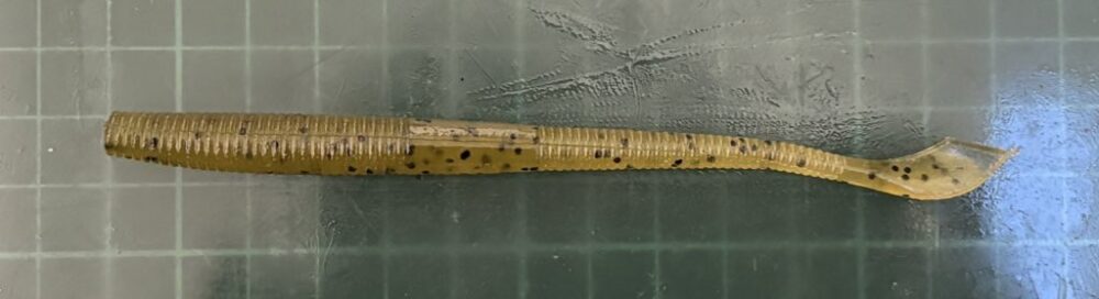 が、濁った状況では最強で、デカい個体だけがバイトするビックワンキラーとして大活躍してます。この平たい面が猛烈に水を押すのでアピールが必要な状況だと最強のストレートワームとなるんですよね。